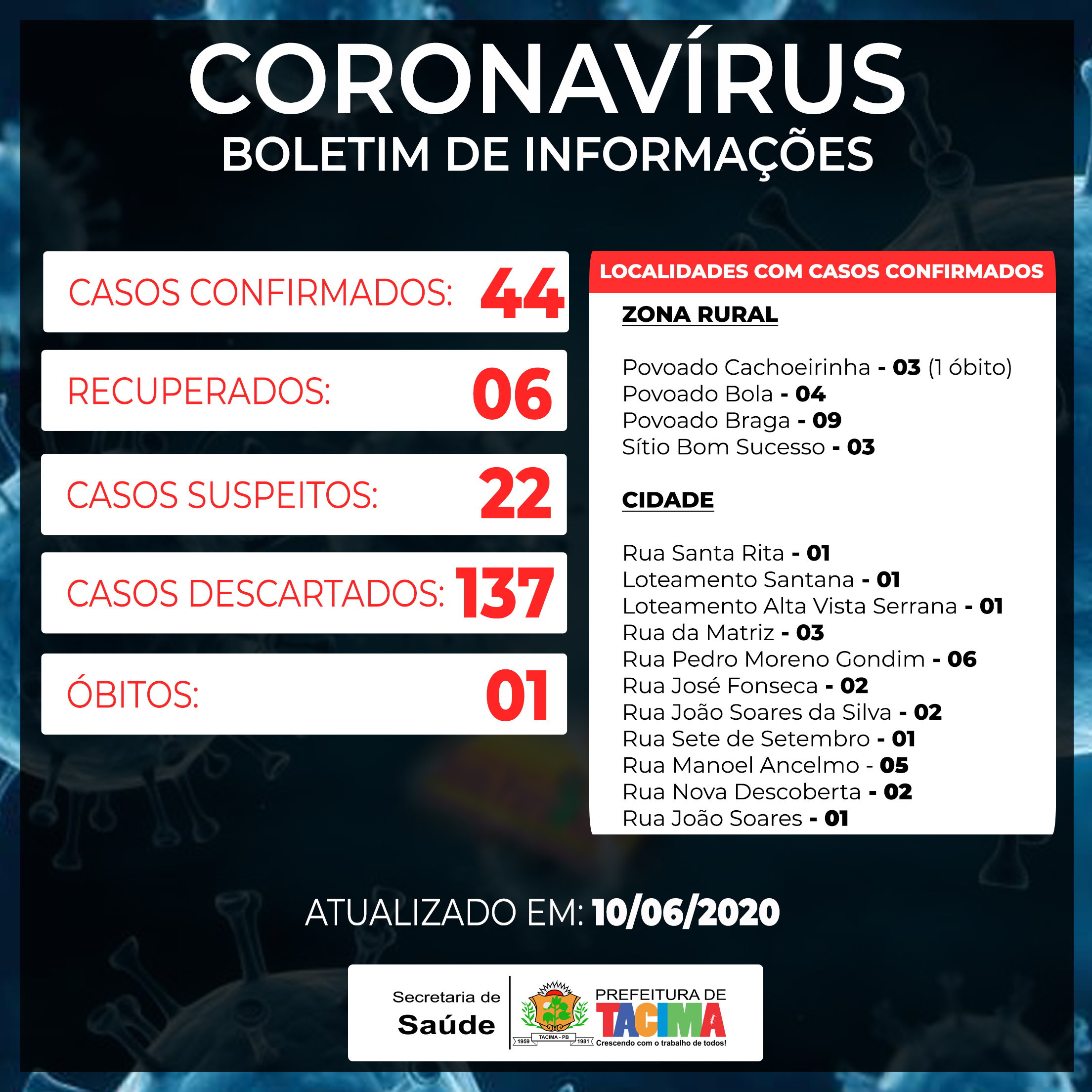 Boletim de informações Covid-19 no município de Tacima que traz novo números atualizado de casos confirmado divulgado pela Secretaria Municipal de Saúde (SMS) de Tacima atualiza nesta quarta (10), o boletim informativo sobre a situação do novo coronavírus no município.